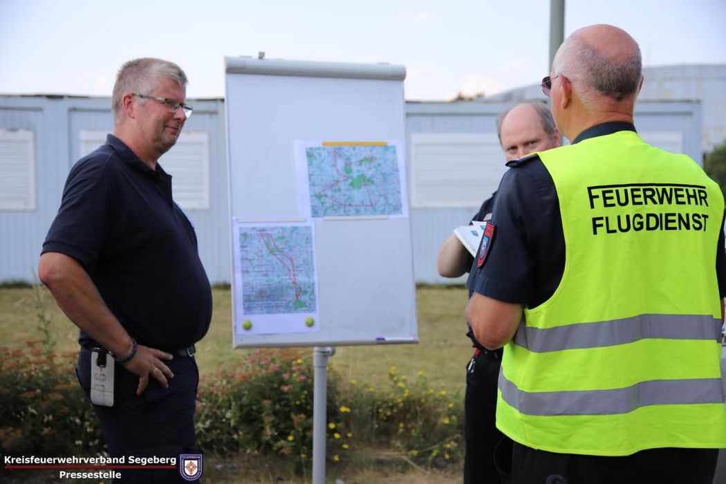 Während die beiden Flieger in der Luft die bereits mit dem Waldbrandkonzepten „SeFo“ und „SePI“, 2012 eingeführten Standardrouten über die Waldgebiete in den Kreisen Segeberg und Stormarn abfliegen und jede Auffälligkeit der Führungsstelle melden, informieren sich Homrich und Nero bei Fachwart Hans Gunter Bostel und seinem Stellvertreter Helmut Nötel über den Feuerwehrflugdienst. Wie ist der Flugdienst überhaupt entstanden, wie ist er aufgebaut oder wie gliedern sich die Dienste? Fragen über Fragen, welche die Fachwarte voller Freude beantworteten, aber auch ihre Sorgen und Probleme schilderten.