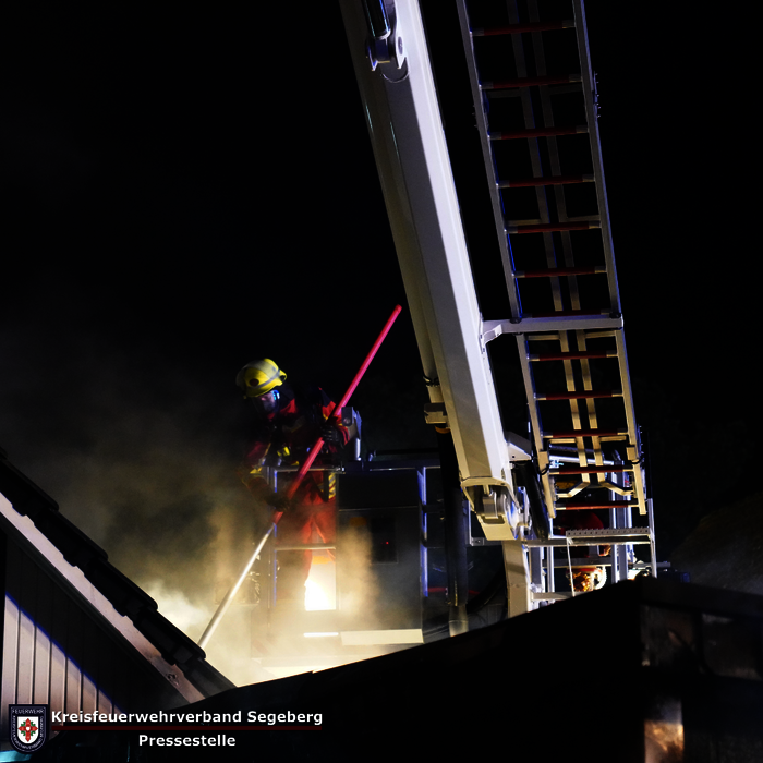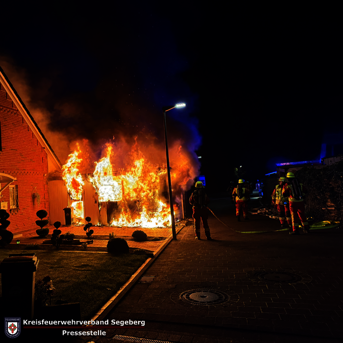 Die Feuerwehr Kaltenkirchen rückte daraufhin mit dem Einsatzstichwort FEU Y (Feuer, Menschenleben in Gefahr) sowie dem Rettungsdienst aus. Beim Eintreffen bestätigte sich die gemeldete Lage: Ein Pkw und eine Leichtbaugarage standen in Vollbrand, das Feuer hatte bereits auf den Dachstuhl einer Doppelhaushälfte übergegriffen.