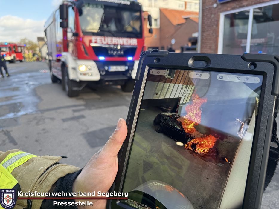 Vor Ort bestätigte sich die Lage. Ein Personenkraftwagen stand im unteren Bereich nahe der Tiefgaragenauffahrt in Vollbrand.