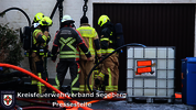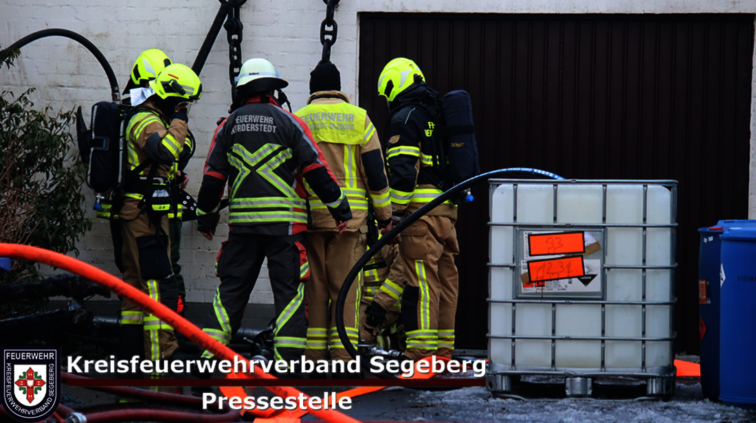 Im hinteren Bereich des Gebäudes befand sich zudem ein Öltank, der durch das Feuer beaufschlagt wurde, sodass Öl auslief. Ein Fachberater Gefahrgut wurde umgehend nachalarmiert. In Abstimmung mit der ebenfalls informierten unteren Wasserbehörde wurde der Inhalt des Tanks in einen IBC-Container umgepumpt. Zur weiteren Aufnahme des ausgetretenen Öls wurde der Gerätewagen Gefahrgut (GWG) der Feuerwehr Kaltenkirchen nachgefordert.